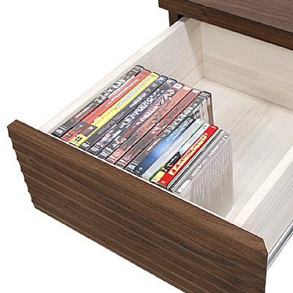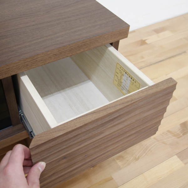 引出し全体をスムーズに引き出す事ができるスライドレールを使用しており、奥の物まで取り出しやすく便利です。引出しは左右に2杯あり、DVDやCDなどをたっぷりと収納していただけます。