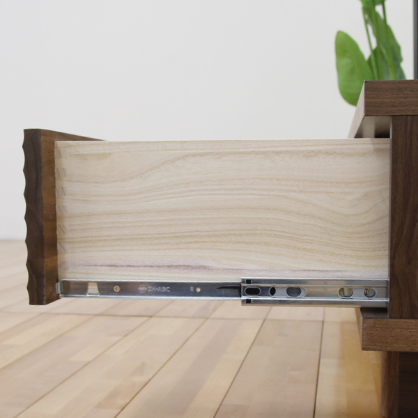 引出しには桐材を使用しています。引き出しのコーナーは伝統的なロッキング組を施しており、酷使にも耐える構造です。また、桐材にはタンニンという防腐能力が高い成分が多く含まれているため、腐食に強いのも魅力です。