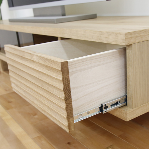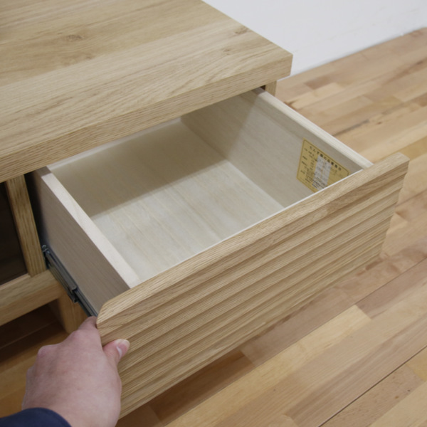 引出し全体をスムーズに引き出す事ができるスライドレールを使用しており、奥の物まで取り出しやすく便利です。引出しは左右に2杯あり、DVDやCDなどをたっぷりと収納していただけます。