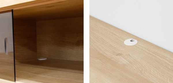 天板とデッキ収納内部には、TVの配線収納に便利な配線キャップが付いています。2箇所に分けて配線できるので、散らかりがちな機器の背面もスッキリと片付きます。