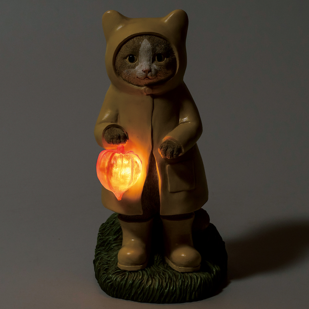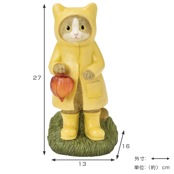 ●黄色いレインコートを着た猫のLED式ソーラーライトです。