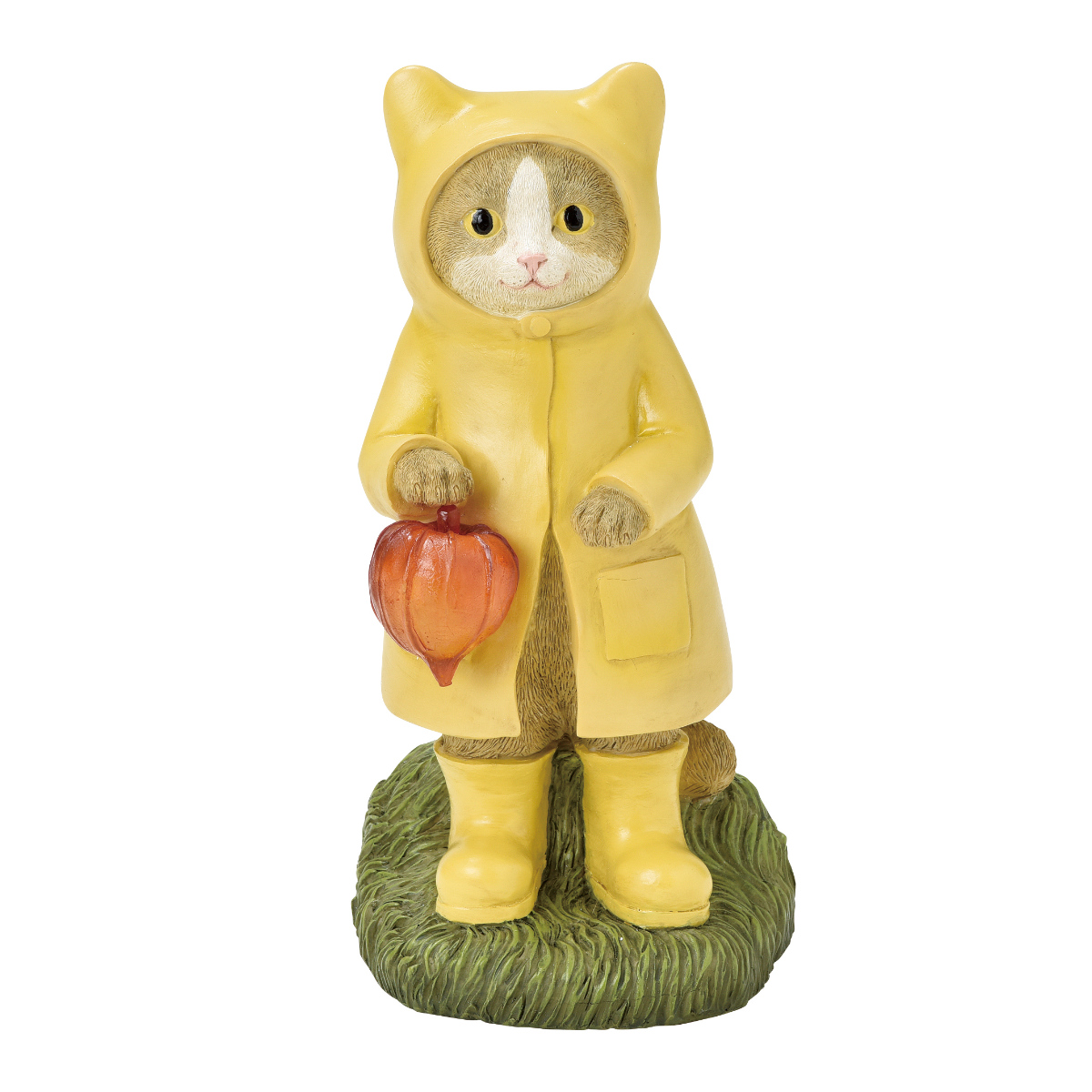 黄色いレインコートを着た猫のLED式ソーラーオーナメントです。手に持っているホオズキが光ります。ライトの色はイエローで、底面に電源スイッチが付いています。付属のモニター電池で約120回の充・放電が可能です。