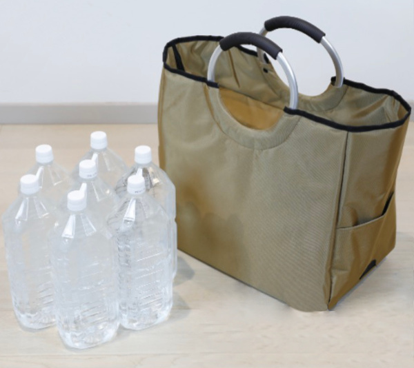 2Lのペットボトルを7本入れても耐えられる安心の耐荷重15kgです。ファスナーが最後まで開き、物の出し入れがしやすいデザインになっています。