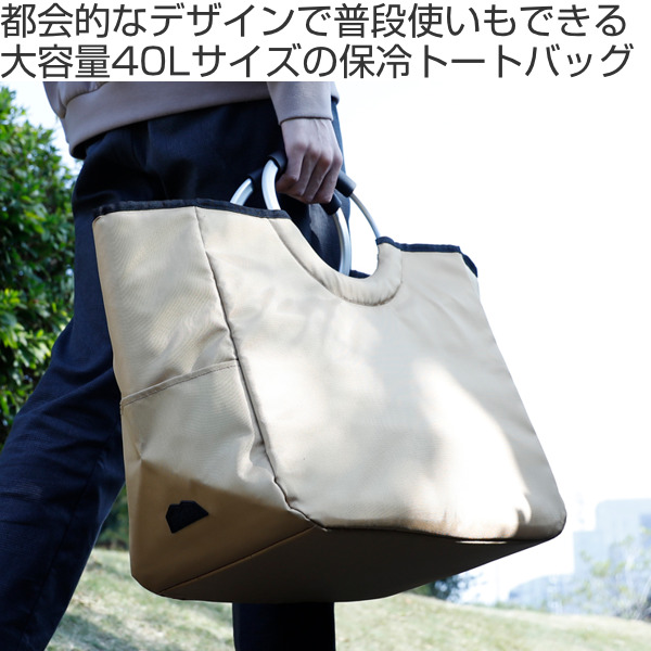 たくさん買ってもしっかり入る大容量40Lサイズの保冷トートバッグです。普段使いがしやすい都会的なデザインです。内側は保冷機能付きなので、冷たい物の持ち運びもできます。本体は汚れが付きづらい素材なので、アウトドアでも安心してお使い頂けます。