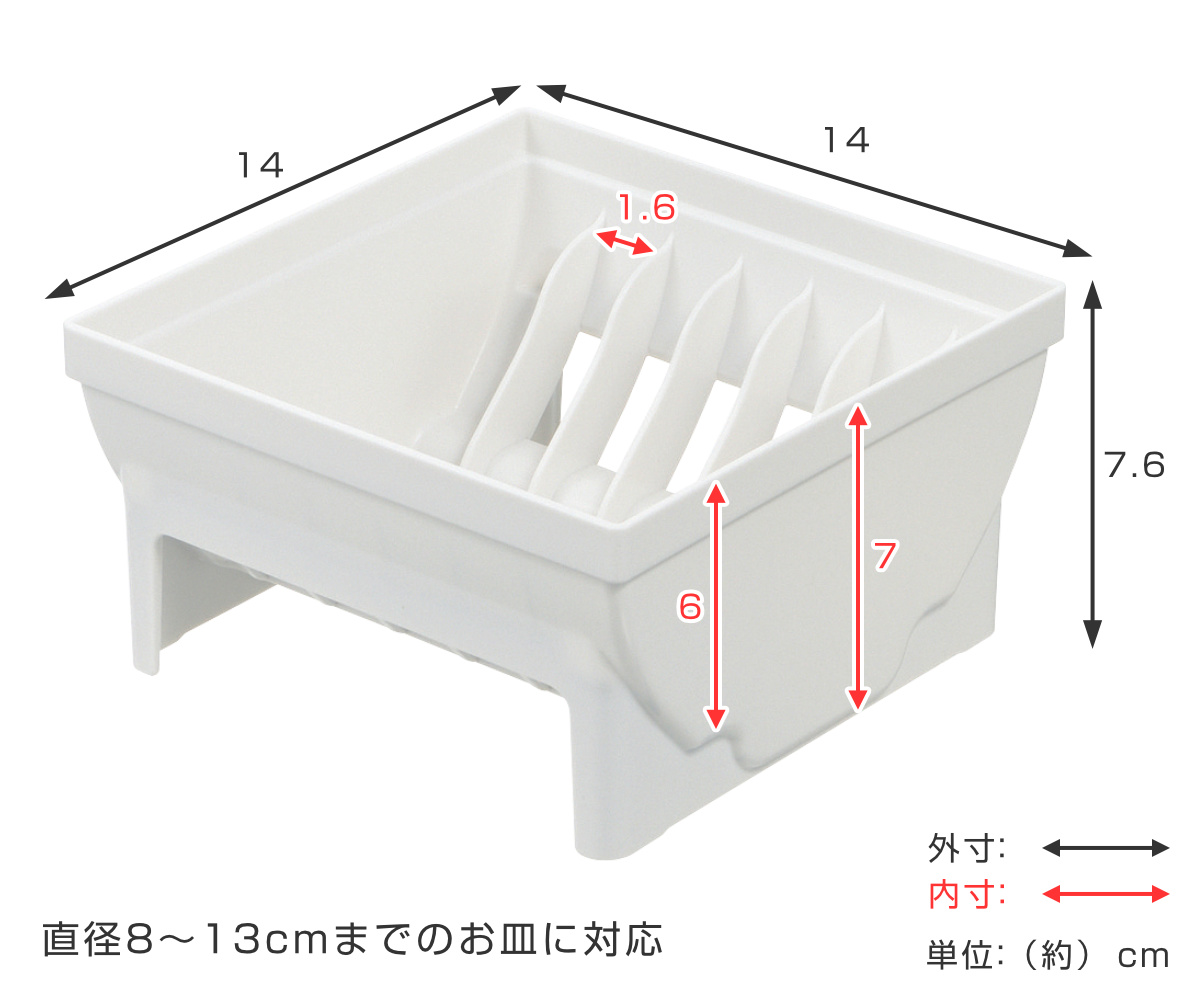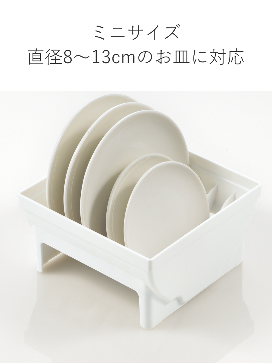 直径8~13cmのお皿を収納できます。醤油皿や銘々皿などの小さめのお皿が最大6枚入ります。抗菌加工済みのプラスチック製で、丸洗いしてお手入れ可能です。