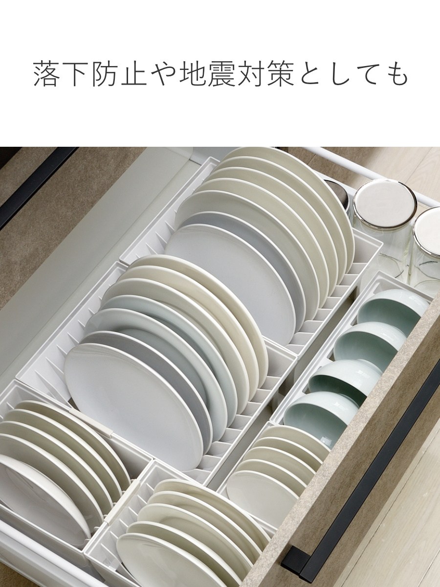 キッチン引き出しの中をサイズ別に分けて、様々な食器の定位置を作り美しく収納できます。どこに何があるか引き出しを開けたときに分かりやすく、出した食器をどこに戻すかも一目瞭然です。また、シンクやコンロ下などの低い位置に立てて収納することで、お皿が崩れたり落下してしまう事を防ぎ、地震対策になります。