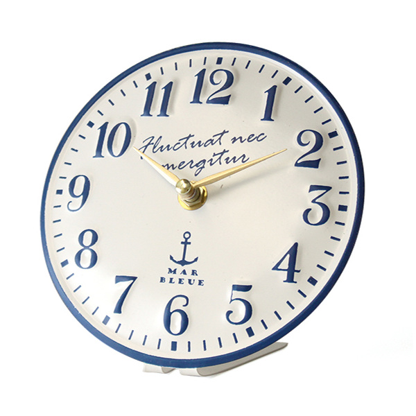 ホーローを思わせるデザインのテーブルクロックです。文字板はシンプルなデザインですが、マリンテイストのロゴや英文がデザインされており、お洒落な空間を演出してくれます。コンパクトなサイズなので、寝室やキッチン、洗面所など限られたスペースにも置くことができます。