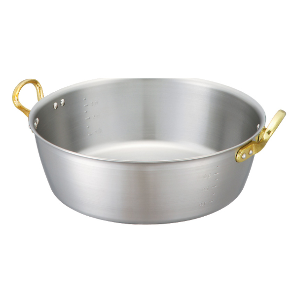 天ぷらや揚げ物料理にぴったりな揚鍋です。ガス火だけでなくオール熱源(IH200V)にも対応します。業務用として作られていますが、家庭でもお使いいただけるサイズです。真鍮製の取っ手は、永く愛用することで味わいのあるアンティーク調の色味になります。