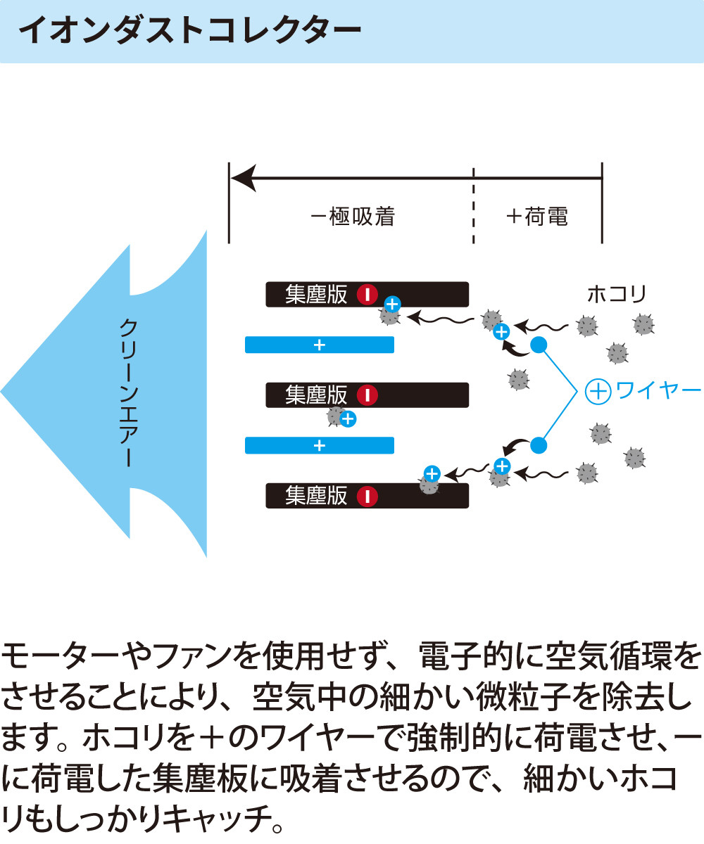 モーターやファンを使用せず、電子的に空気循環をさせることにより、空気中の細かい微粒子を除去します。ホコリをプラス(+)のワイヤーで強制的に荷電させ、マイナス(-)に荷電した集塵版に吸着させるので、細かいホコリもしっかりキャッチします。
