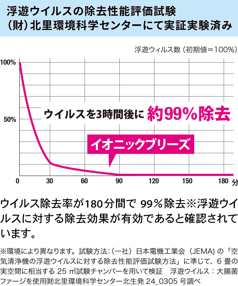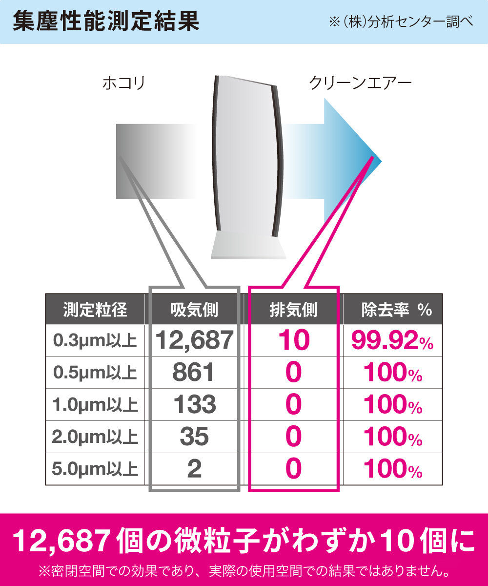 パーティクルカウンター(粉塵計測機)の実験結果で、空気中の0.3マイクロメートル以上の粒径の粉塵を約99%除去したことが確認されています。そのため、0.3マイクロメートル以上の微粒子である細菌、カビ、PM2.5、黄砂、花粉、ハウスダストの除去が期待できます。