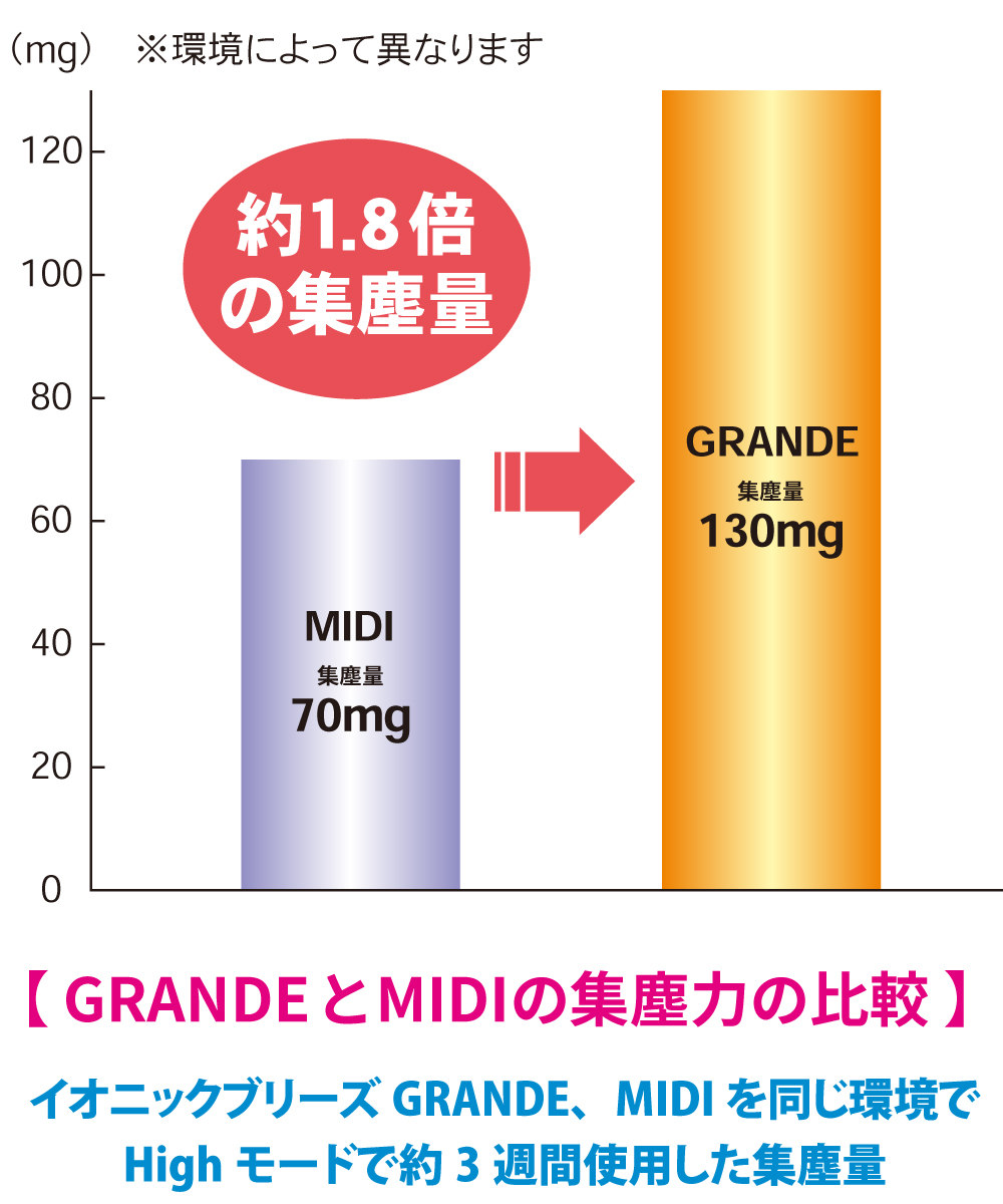 集塵量はイオニックブリーズMIDIの約1.8倍です。※環境によって効果が異なります。
