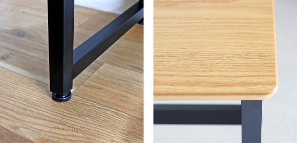 | アジャスター付き 脚には、アジャスターが付いているので、ぐらつきを防ぐことができます。 | 丸みのある天板 天板の角は丸みを持たせたデザインになっていますので、お子様がおられるご家庭でも安心してお使いいただけます。 |