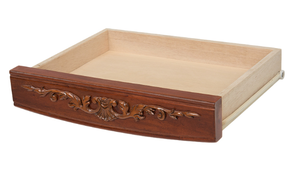 マホガニー材独特の縞模様と赤褐色の美しい風合いが特徴です。耐久性に優れ加工しやすい材質のため、細部まで美しい彫りを施しています。蔓をモチーフにした装飾を、職人がひとつひとつ手彫りしています。