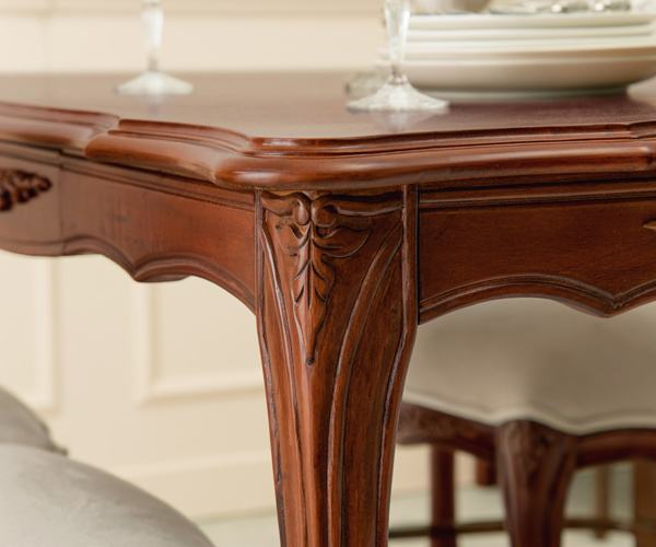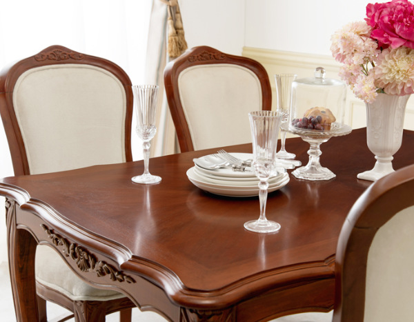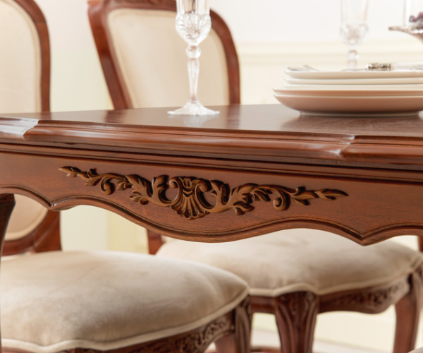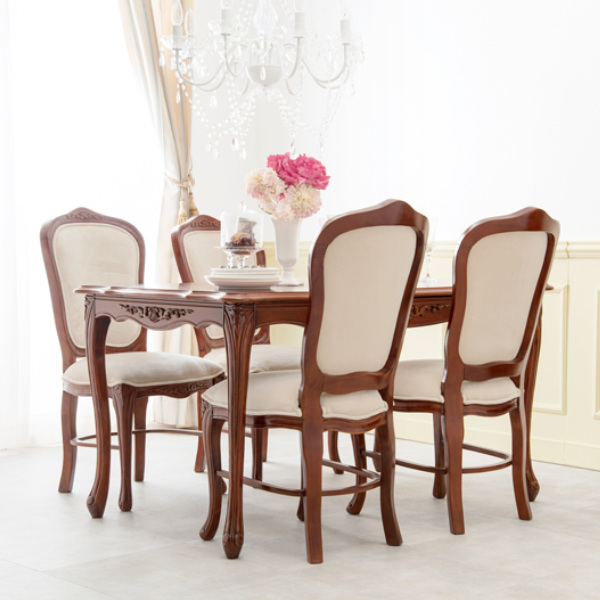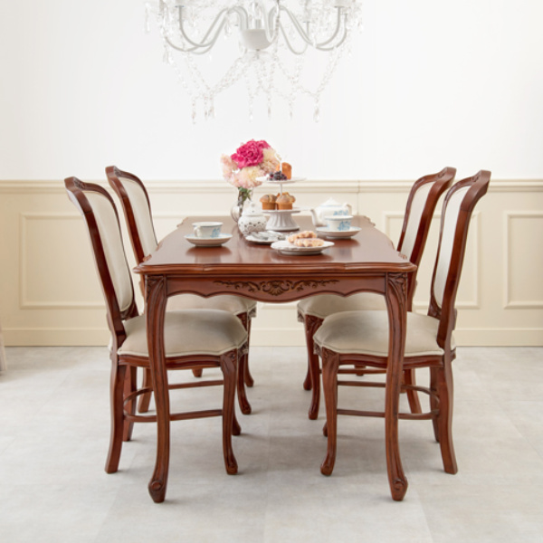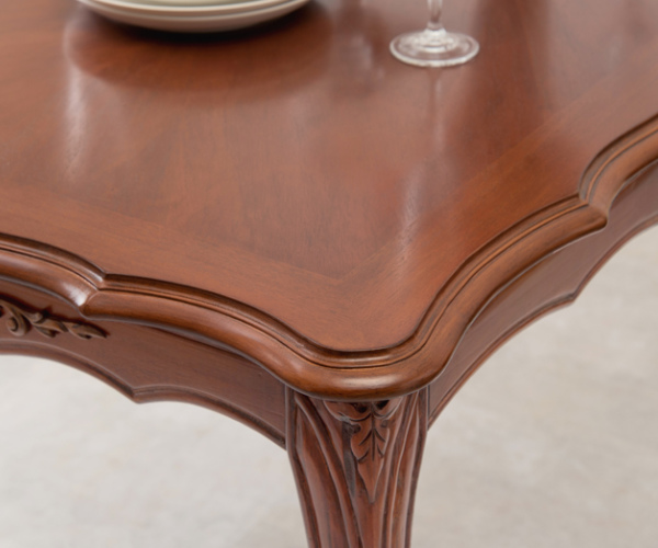 細部のデザインにこだわった、アンティーク調の上品なダイニングテーブルです。大人女子のインテリアにピッタリな、エレガントなフォルムと上品な色合いが特徴的です。置くだけで格式高いリビングを演出します。