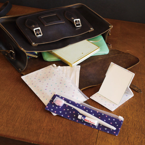 ●内側にビニールコーティングが施され、歯ブラシが濡れたままでもカバンの中が濡れる心配がありません。