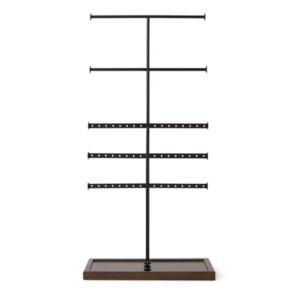 長さが異なる5本のT字型のバーが印象的なジュエリースタンドです。ネックレスやピアス・ブレスレット、時計等を引っ掛けてお店のディスプレイのように飾りながら収納できます。スタンドの高さは約48cmと高さがあるので、長さのあるアクセサリーも引っ掛けることが可能です。