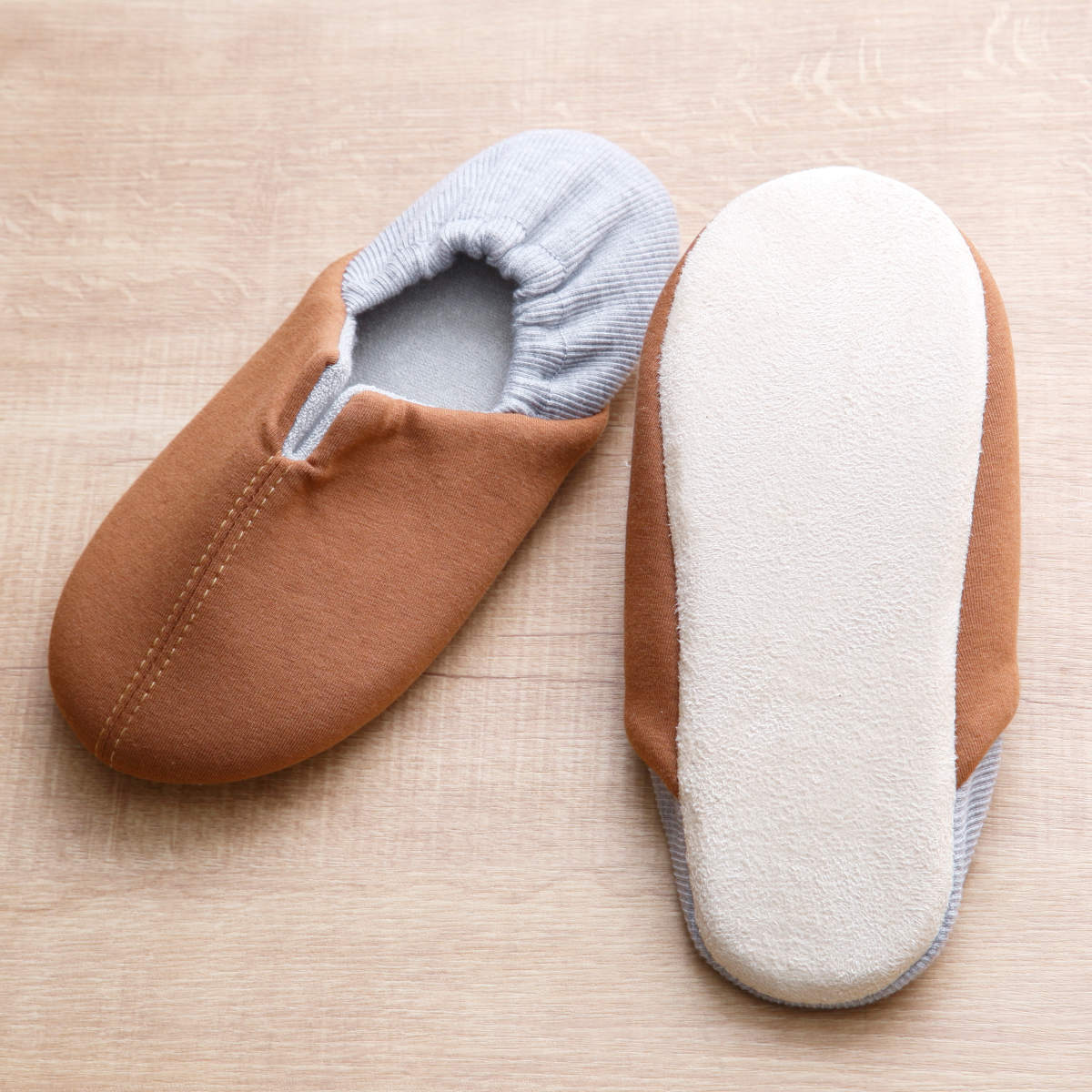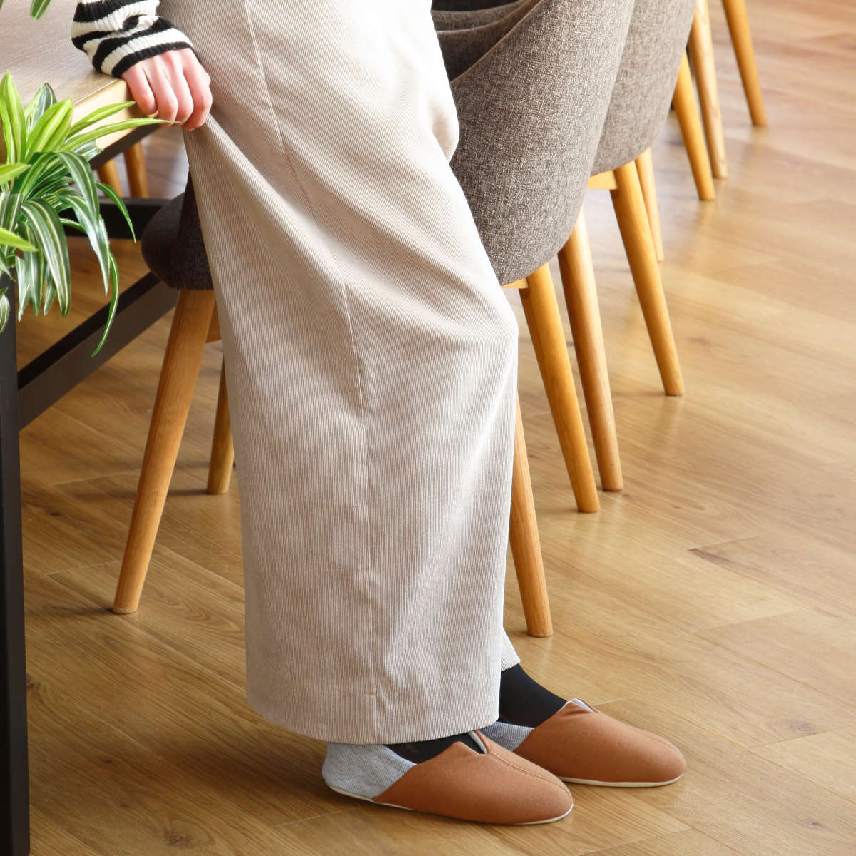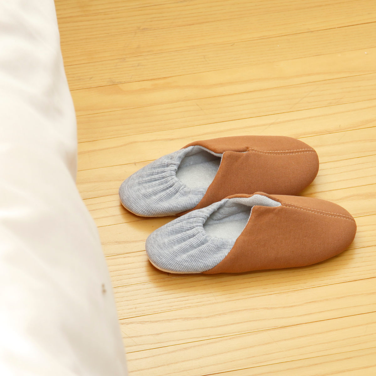 底面には滑りにくい生地を使用しています。フローリングなどの床材に優しく、パタパタ音が鳴りにくいので、日常使いに適しています。