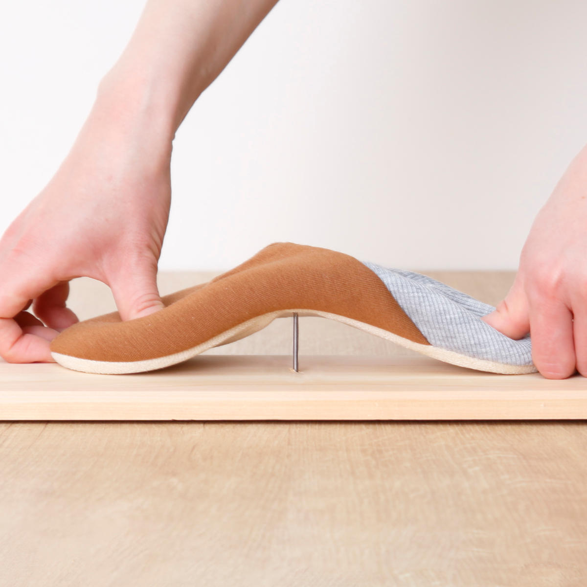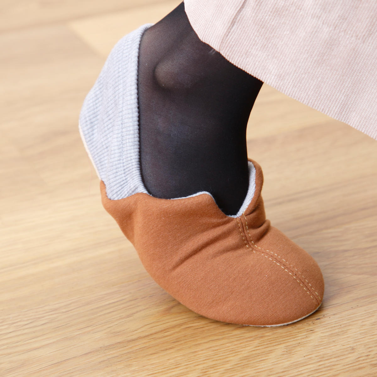かかと部分は伸縮性があり折りたたんで履けるので、脱ぎ履きがしやすく日常使いに便利です。災害時には、かかとのゴムをサッと被せるだけで防災スリッパになります。