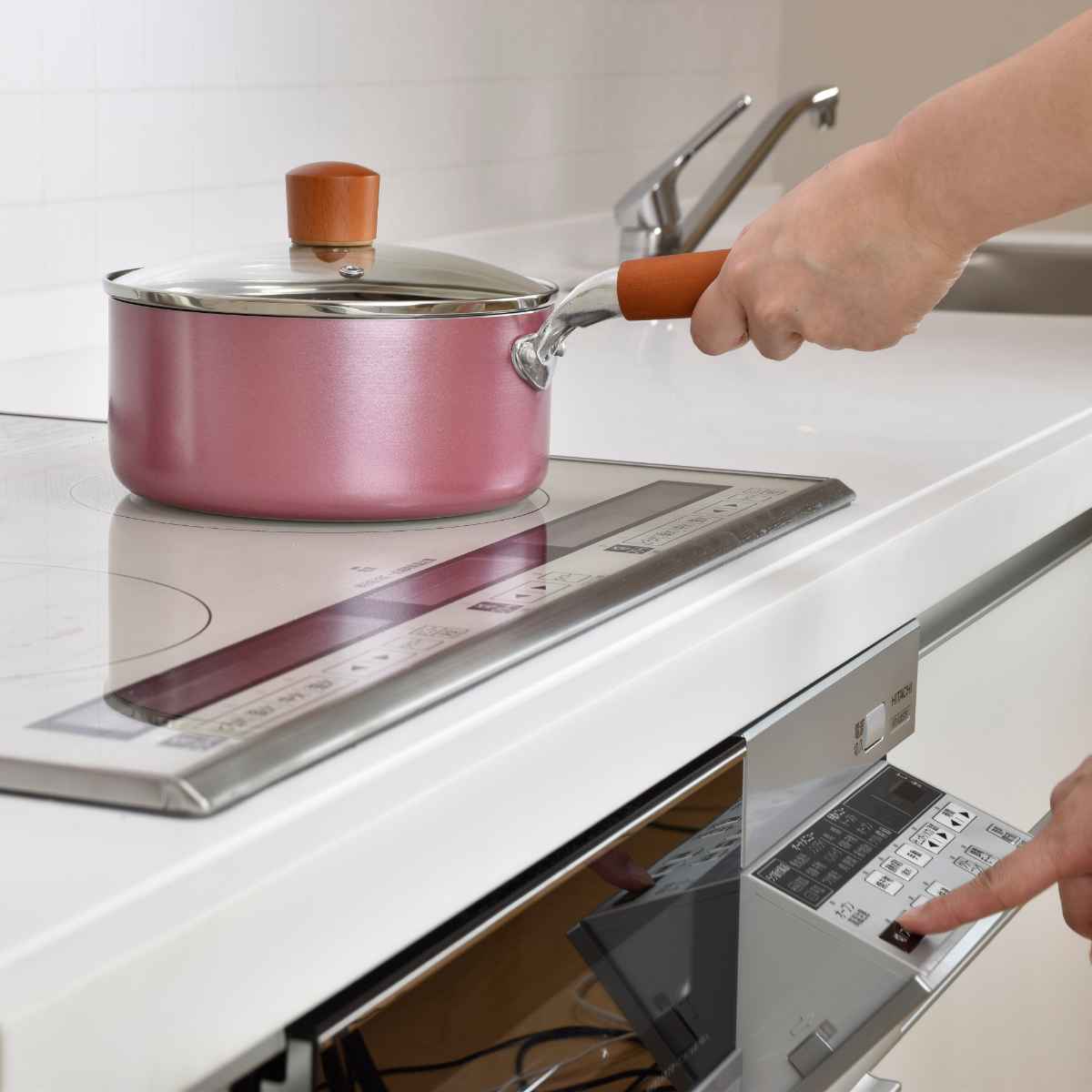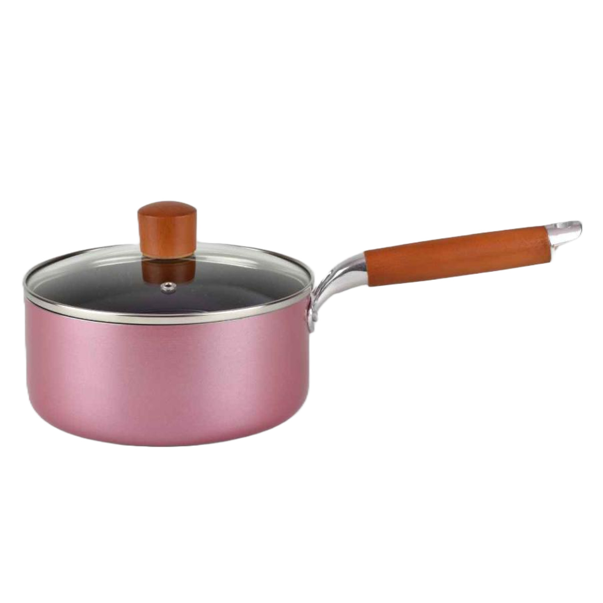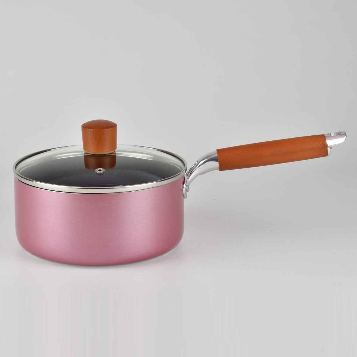 エレガントなピンクの片手鍋18cmです。内面には4層のマーブルコーティングが施されており、通常のフッ素樹脂加工よりも耐久性が数倍高いので、角の丸い金属お玉・ヘラもお使いいただけます。また、食材がくっつきづらく、焦げ付きづらいので、すべりが良く快適に調理できます。本体は熱伝導の良いアルミニウム合金で、茹でる・煮る・焼く・揚げる等の色々なお料理に幅広くお使いいただけます。