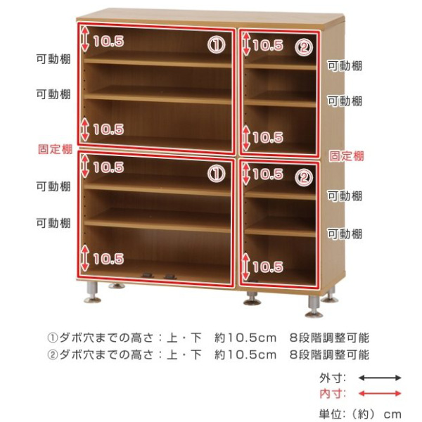 高さを調節できるシューズボックスです。大・小各4枚の可動棚板の設置場所を変えられます。(大・小各1枚は固定棚板です。)靴の高さに合わせて調節すればスペースを有効活用できます。ダボ穴の間隔は約3.2cmです。