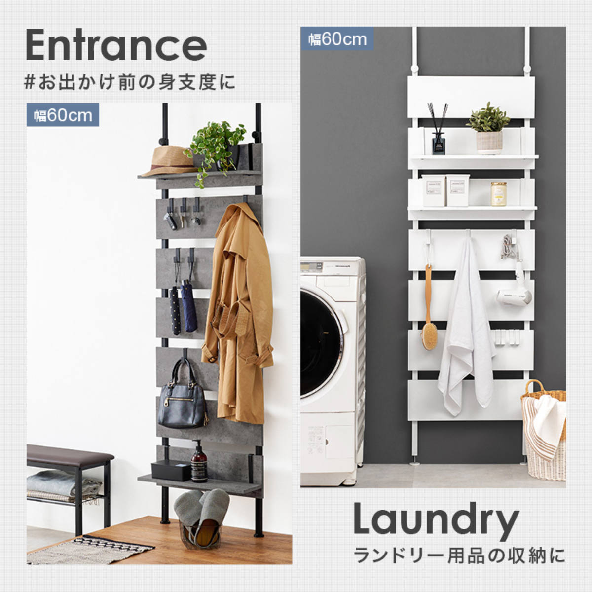 壁面に設置できる突っ張り式のウォールラックです。フックと棚板が付属しているので、設置するだけで手軽に収納力がアップします。天井や壁に穴を空けるなどの工事が不要なので、賃貸住宅にお住まいの方にもおすすめです。