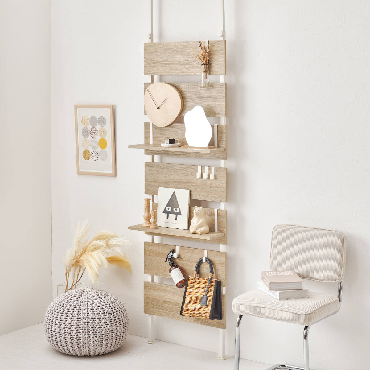 棚板2枚とフック7個が付属しています。どちらもの本体の板に引っ掛けるだけで簡単に取り付けられ、いつでも位置を変えられます。お気に入りの小物を飾ったり、普段使いのアクセサリーやバッグを掛けておけます。