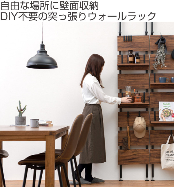 壁面に設置できる突っ張り式のウォールラックです。フックと棚板が付属しているので、設置するだけで手軽に収納力がアップします。天井や壁に穴を空けるなどの工事が不要なので、賃貸住宅にお住まいの方にもおすすめです。