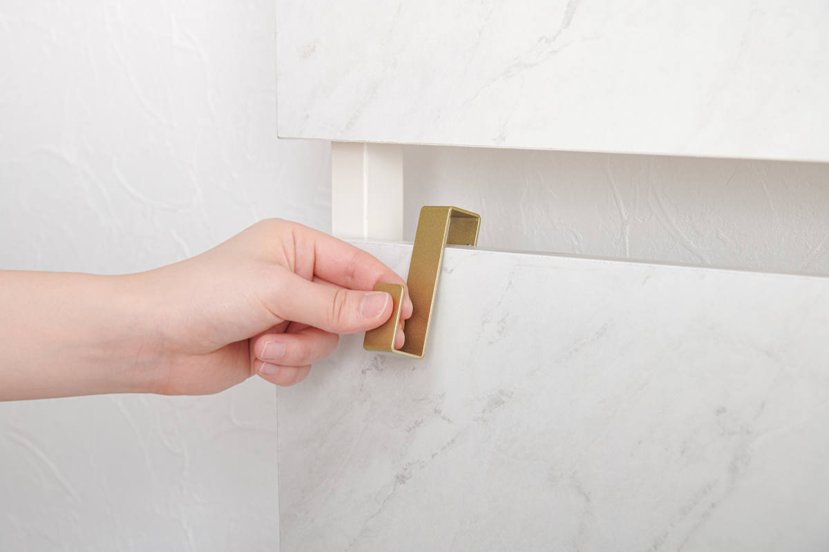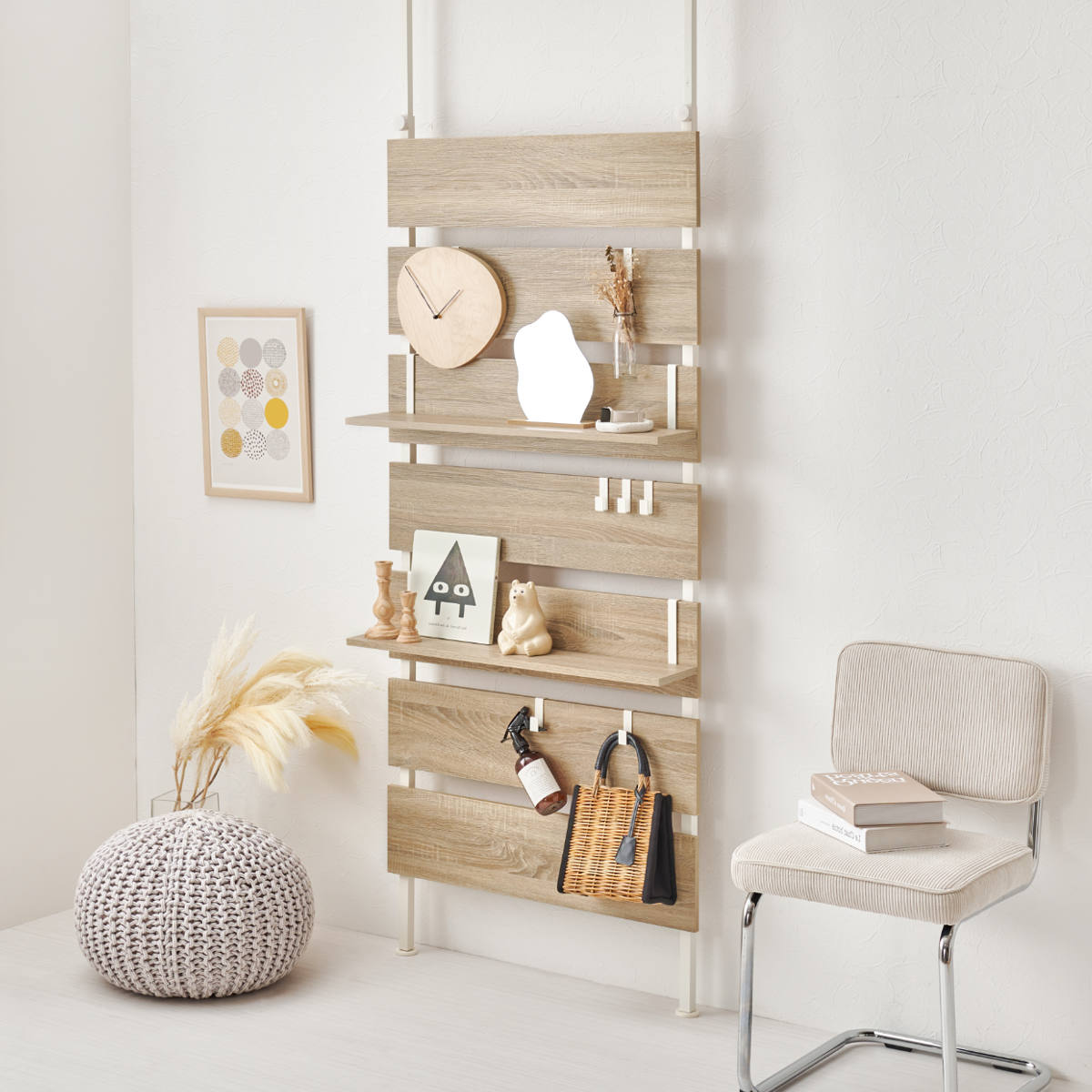 棚板2枚とフック7個が付属しています。どちらもの本体の板に引っ掛けるだけで簡単に取り付けられ、いつでも位置を変えられます。お気に入りの小物を飾ったり、普段使いのアクセサリーやバッグを掛けておけます。
