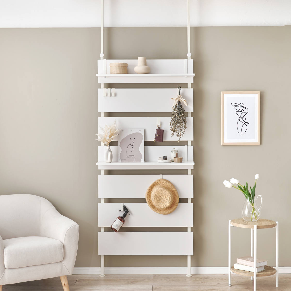 突っ張り ウォールラック 幅80cm ラダーラック 棚 壁面 収納 木目調 つっぱり ( 幅 80 スリム ラック 壁面収納 収納ラック ウォールシェルフ パーテーション 薄型 オープンラック 目隠し 間仕切り 仕切り フック 棚付き ) 【マーブルホワイト】