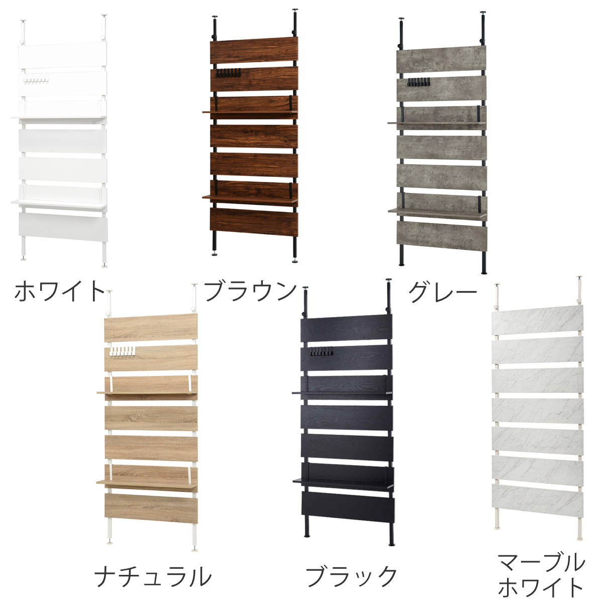 | 材質 | 棚板:メラミン樹脂化粧繊維板(ホワイト)、プリント紙化粧繊維板(ナチュラル、ブラウン、ブラック、グレー、マーブルホワイト) フレーム:スチール(粉体塗装) |