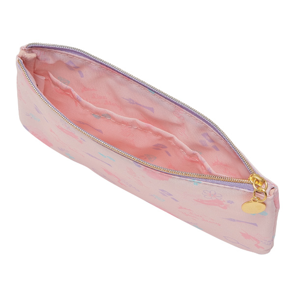 ポーチは薄型で、かばんにも入れやすいサイズです。中面にはポケットがついているので、細々したものも仕分けて入れられます。化粧ポーチや小物入れなどに便利です。