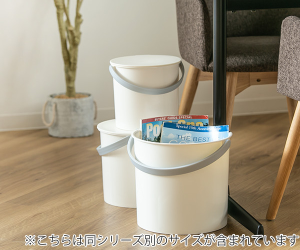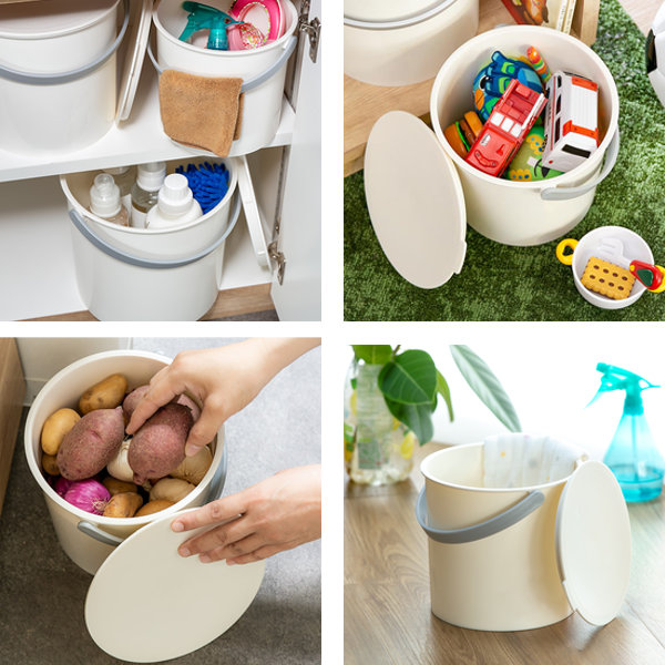 フタつきバケツで中身が見えないので、色々な物が収納できます。キッチンでは食料ストッカーとして、お子様のおもちゃ入れや、清掃用品をまとめて収納でき、シーンに合わせて使い分けられます。