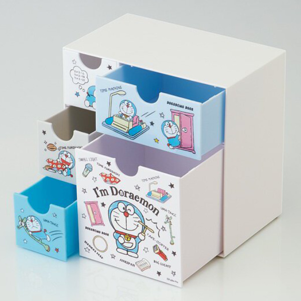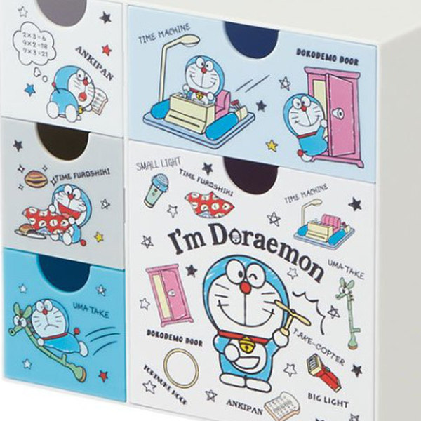 いろんな表情をしているドラえもんが描かれていて、可愛らしい雰囲気のミニチェストです。