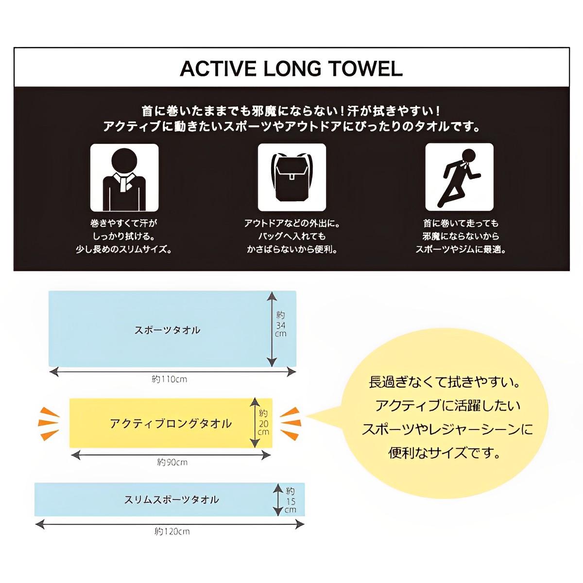 巻きやすくて汗がしっかり拭けるアクティブロングタオル