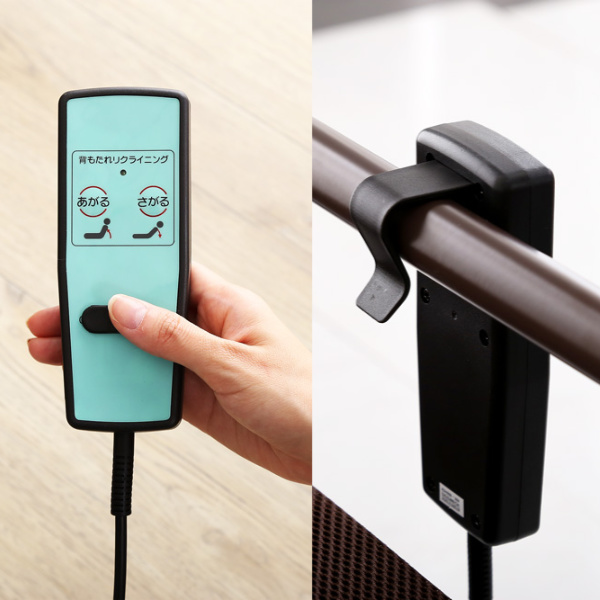 ベッドのリクライニングはリモコンで簡単に行うことができます。ボタンもシンプルな表記で操作しやすい仕様になっています。背面にフック付が付いていて、ベッドのフレームや手すりなど使いやすい場所に掛けられます。背もたれと脚部が同時に昇降するヘッド・フット連動型ですが、足元中央の金具を外せば、脚部分をフラットな状態で使用することが可能です。