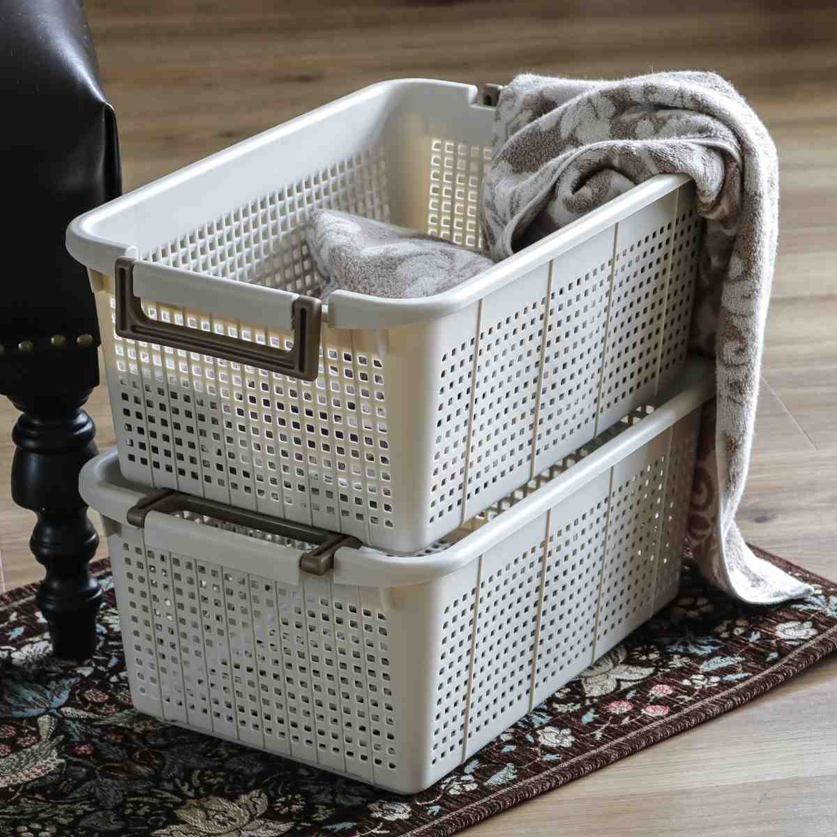積み重ねができる構造の収納バスケットです。縦のスペースを有効活用できて便利です。2段積み重ねた時の高さは約35cmです。