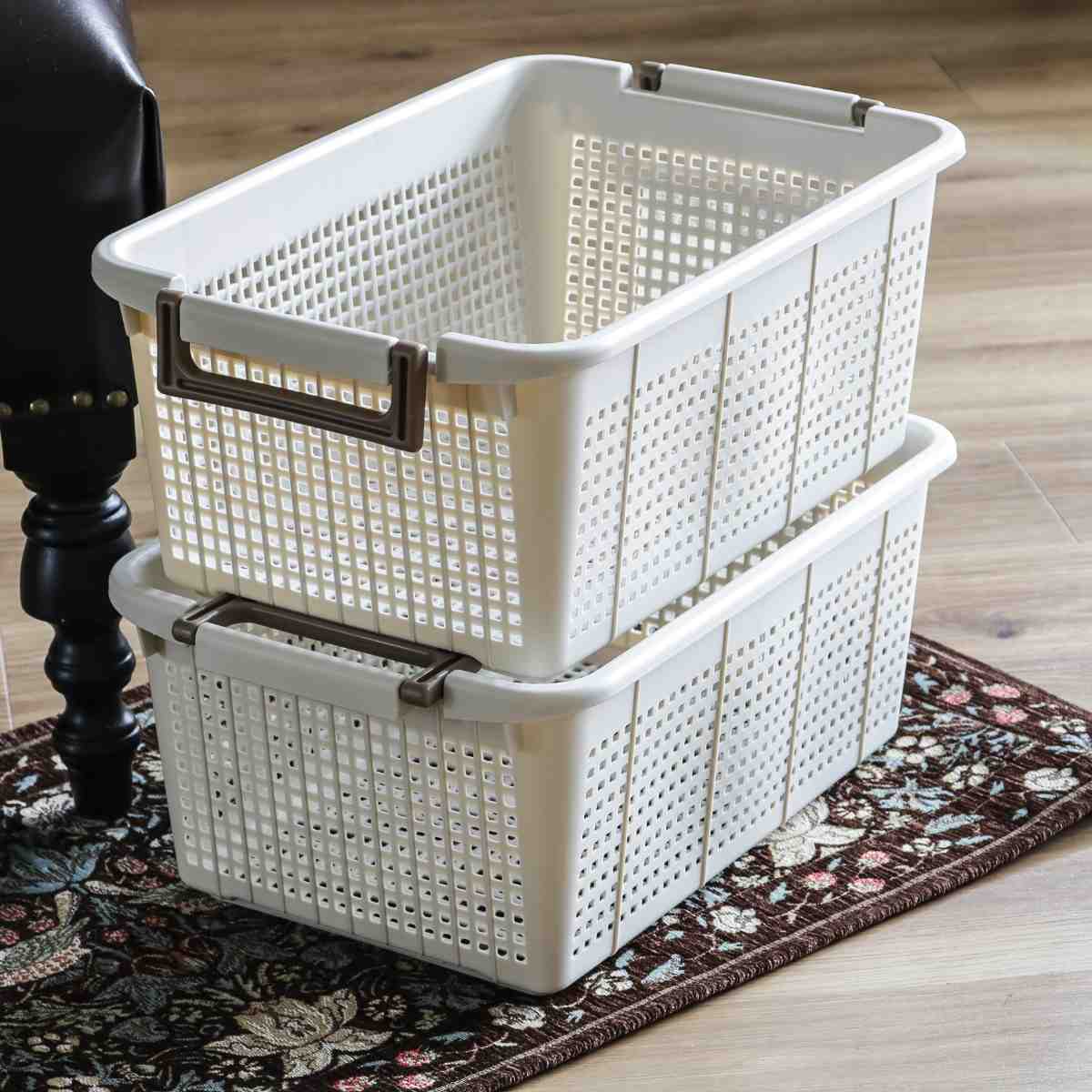 収納バスケットには取手があるので持ち運ぶ際に便利です。積み重ねて使用する際は、画像のように取手を内側に倒してお使いください。