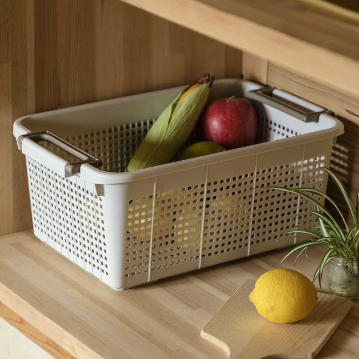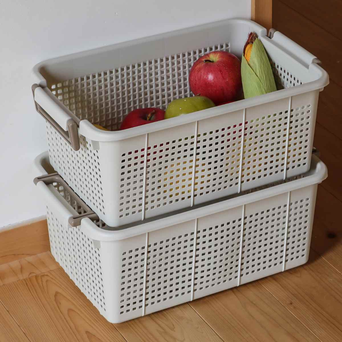 収納バスケットは通気性が良いため、果物や野菜、調味料のストックを入れるのにちょうど良いです。中身が見えるので、どこに何を収納しているのか一目で分かります。