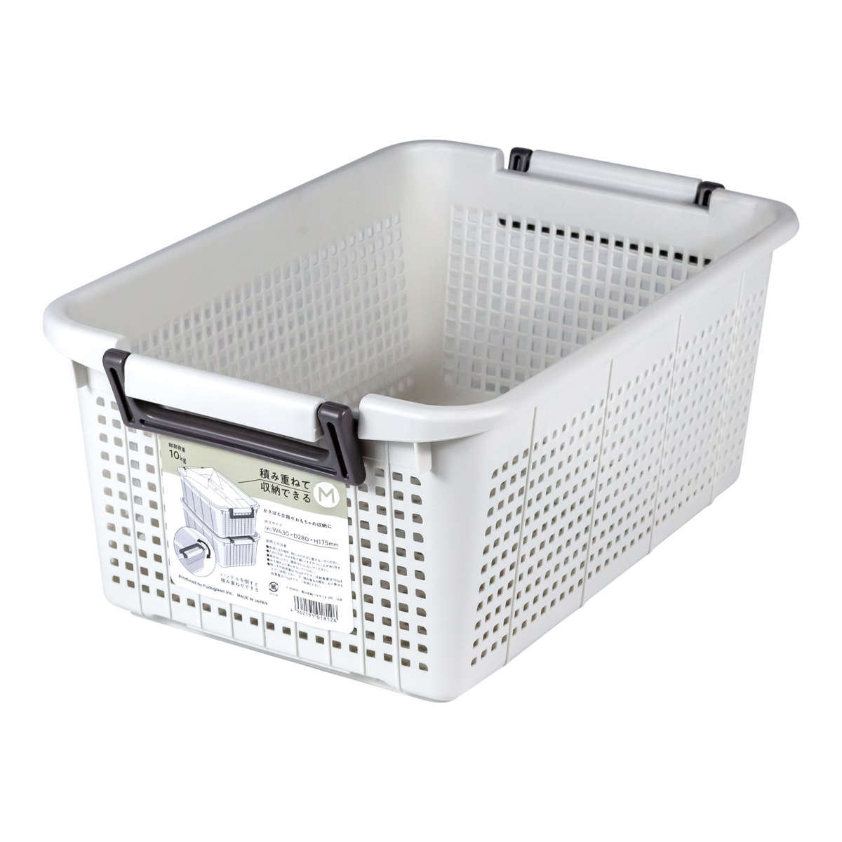 バスケット M 幅28×奥行43×高さ17.5cm スタッキング 4個セット ( 収納ケース 積み重ね 収納ボックス 持ち手付き 収納 ケース ボックス 収納バスケット プラスチック ストッカー クローゼット収納 日本製 ) 【アイボリー】