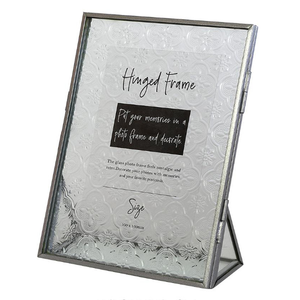 フォトフレーム フラワー ガラス ヒンジドフレーム アンティーク ( 写真立て フォトスタンド 卓上 おしゃれ インテリア 写真スタンド レトロ ディスプレイ ガラスフレーム アートフレーム 縦置き オブジェ 置物 鉄 アイアン )【 シルバー 】