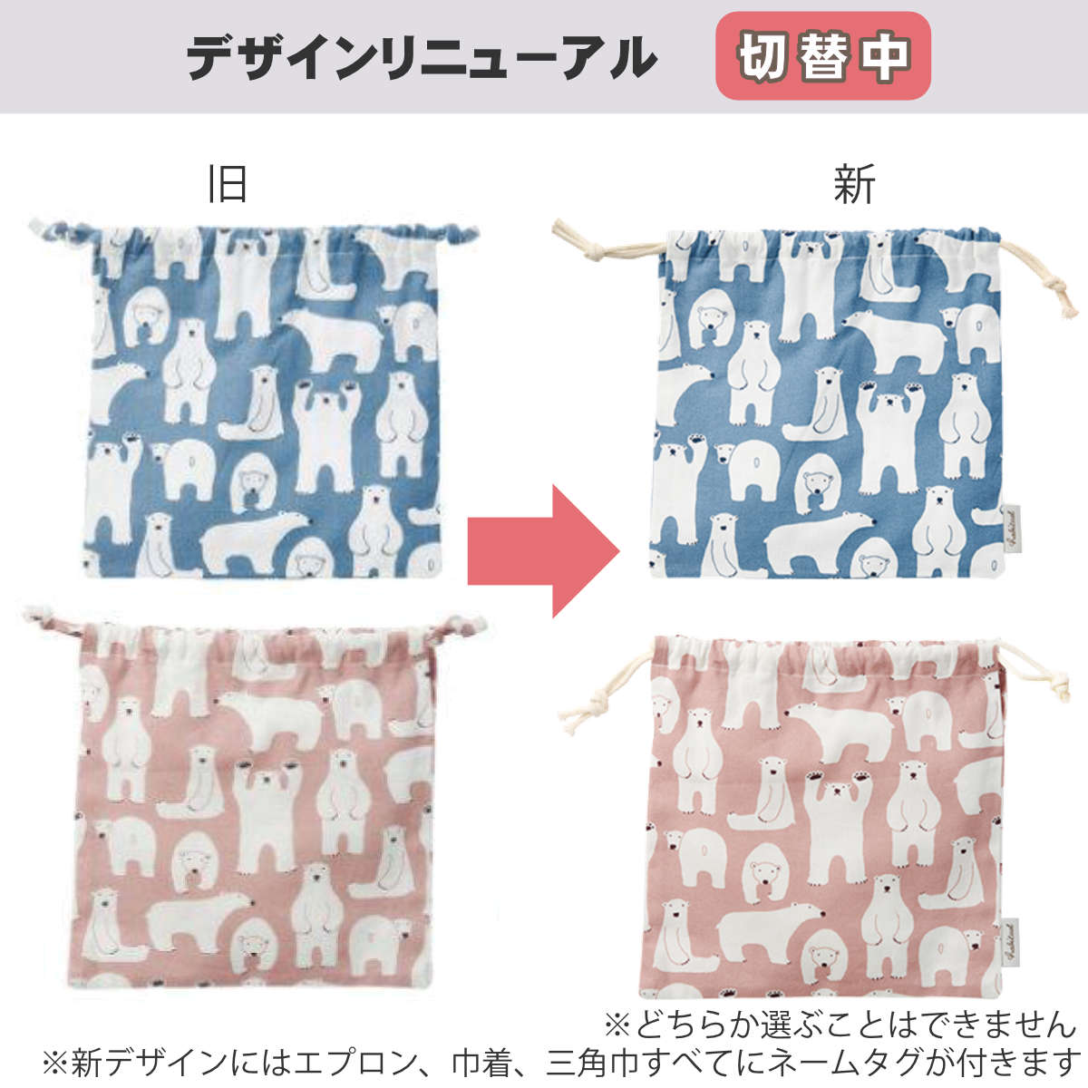 ・エプロン、巾着、三角巾すべてネームタグ付きへ変更いたします。