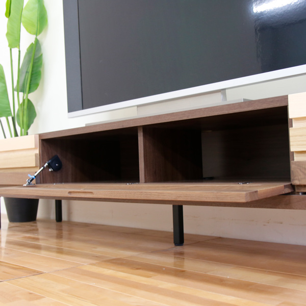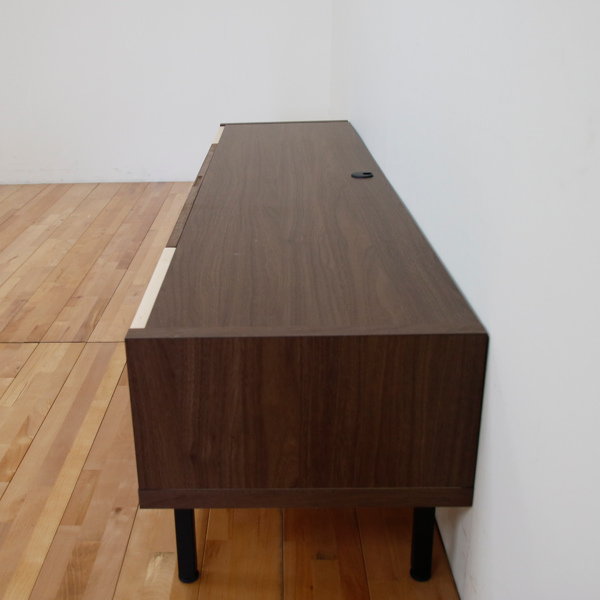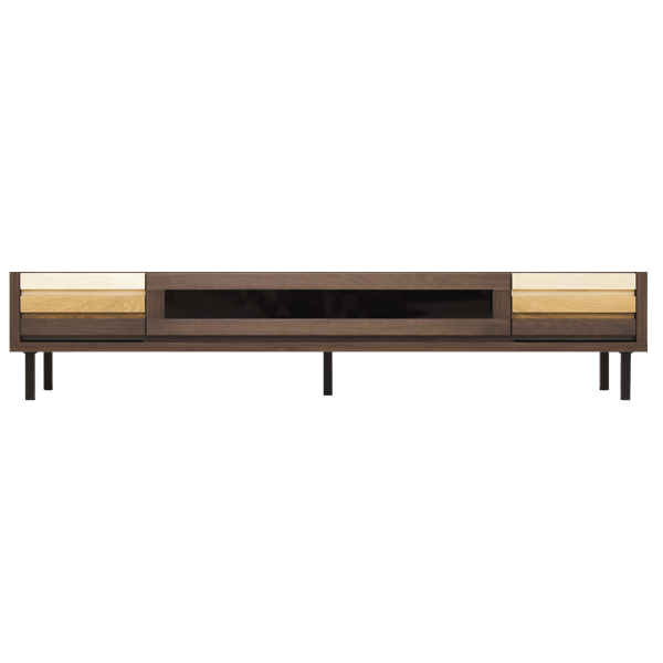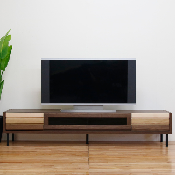 ウォールナットをベースに、ホワイトオーク材・メープル材を組み合わせて作ったオシャレでかわいいテレビボードです。幅は約200cmで大型テレビも十分置けるサイズです。表面材には天然木を使用しているので高級感があります。