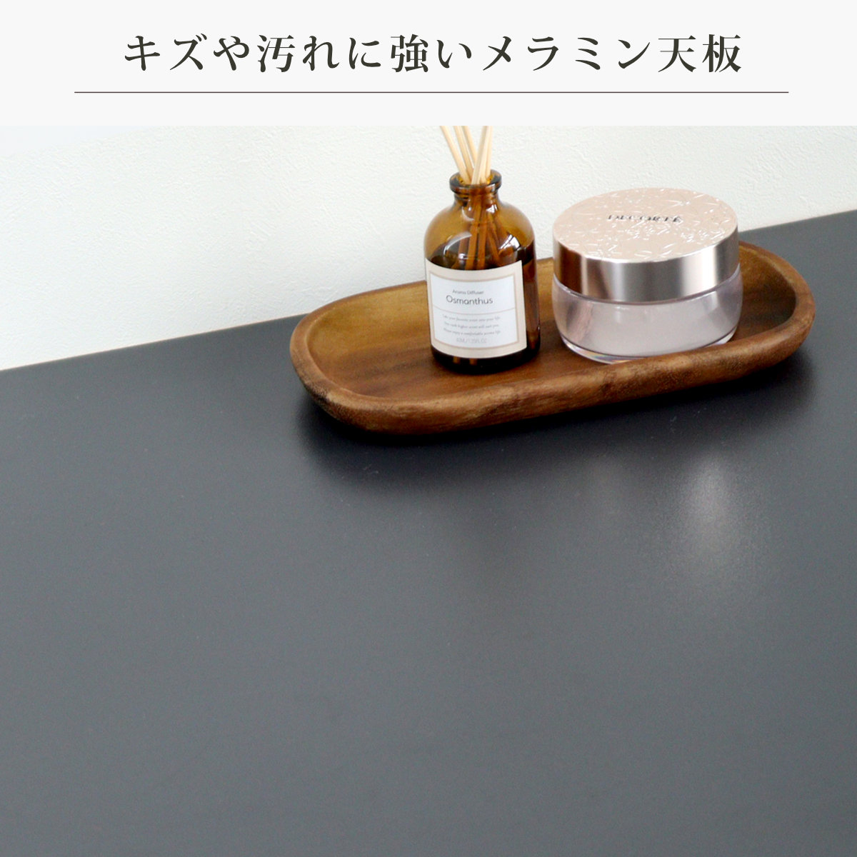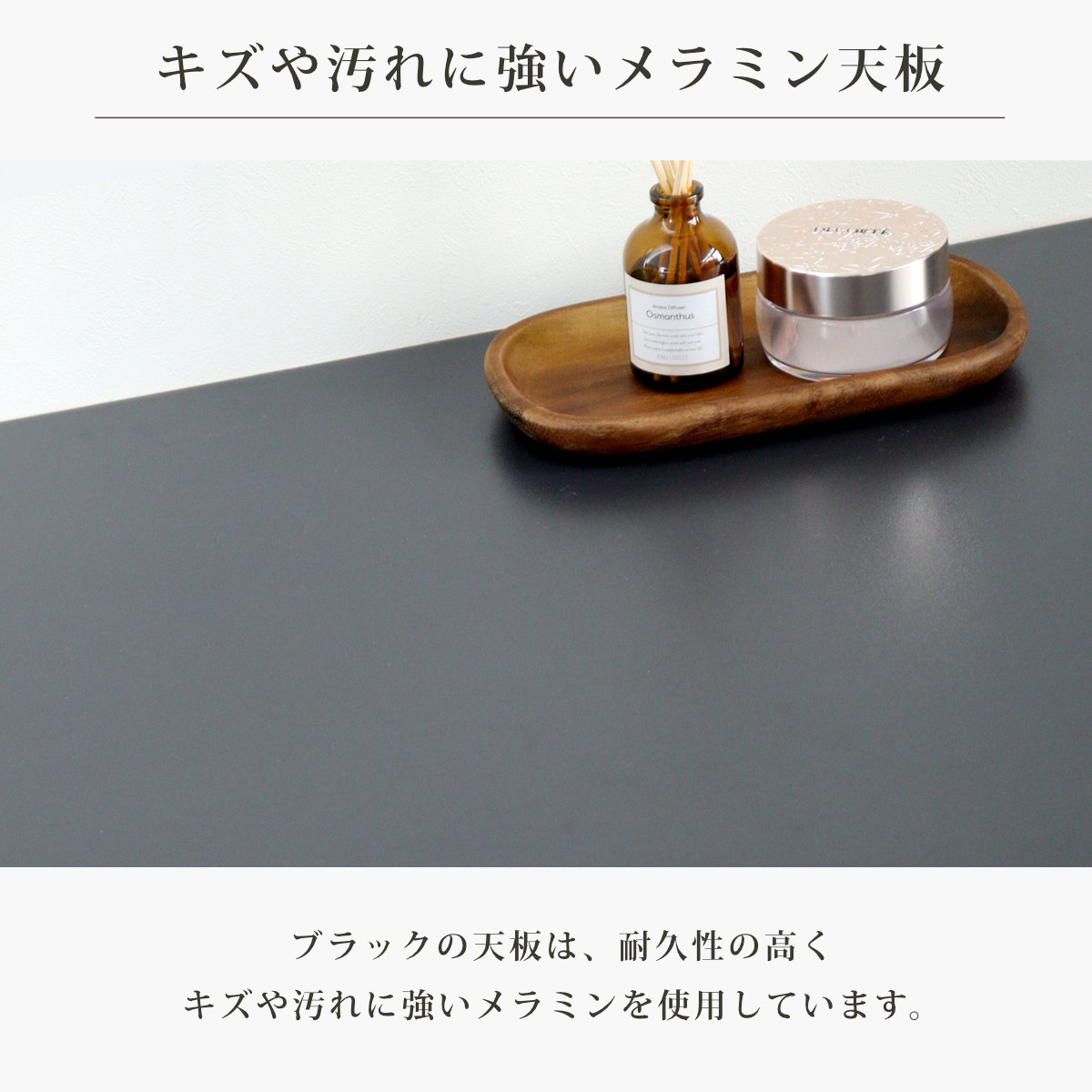 ブラックの天板は、耐久性が高くキズや汚れに強いメラミンを使用しています。