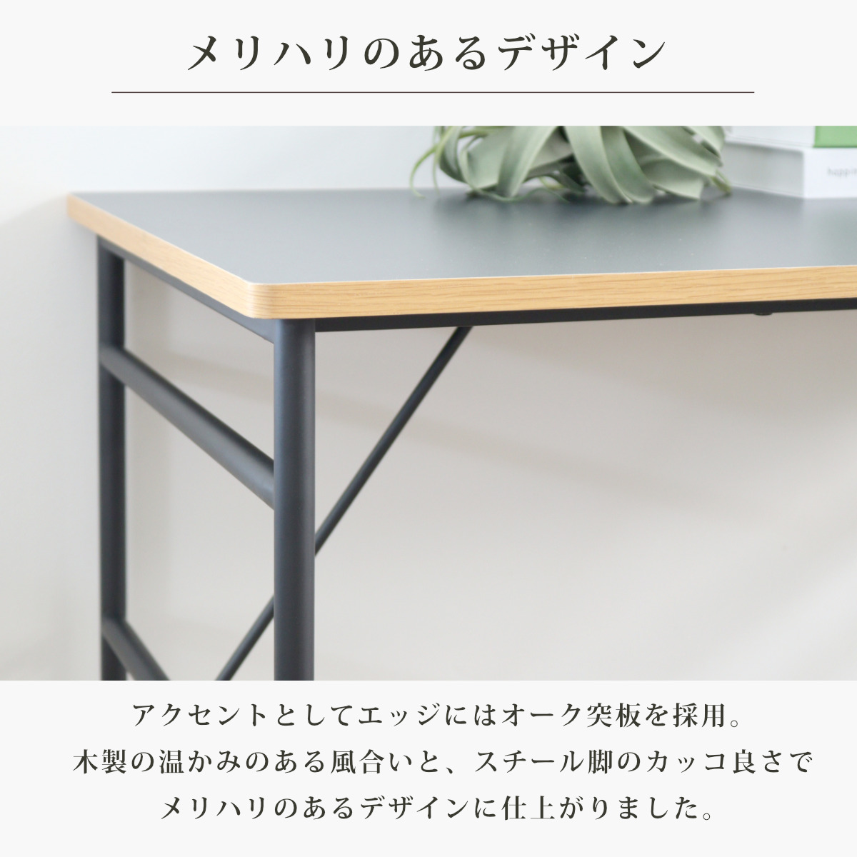 アクセントとしてエッジにはオーク突板を採用。木製の温かみのある風合いと、スチール脚のカッコ良さでメリハリのあるデザインに仕上がりました。