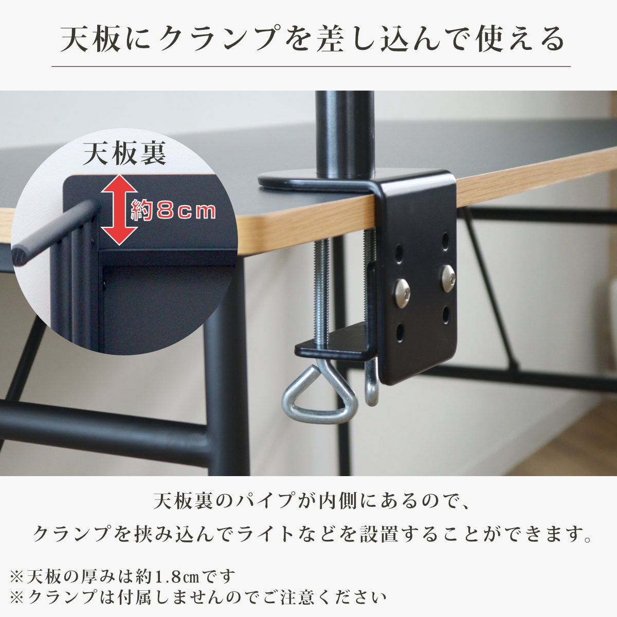 天板裏のパイプが内側にあるので、クランプを挟み込んでライトなどを設置することができます。