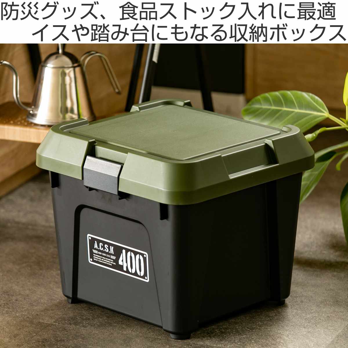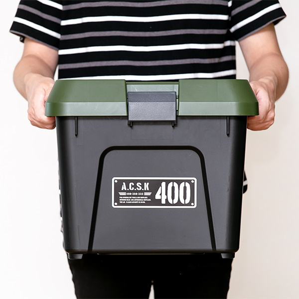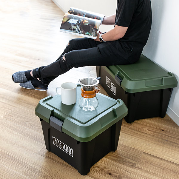 フタを閉めれば生活感を隠せるので、防災グッズ・食品・日用品ストックの収納に最適です。ミリタリーカラーがカッコよく、リビングやキッチンの見えるところに置いてもおしゃれなデザインです。