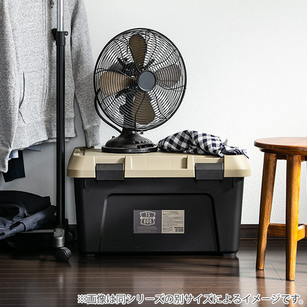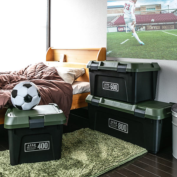 屋外はもちろん、室内のおもちゃ、衣類などいろいろな形や大きさのアイテムをざっくり収納できます。シリーズで使用すれば、インテリアとしても様になる無骨でクールな雰囲気の収納ボックスです。