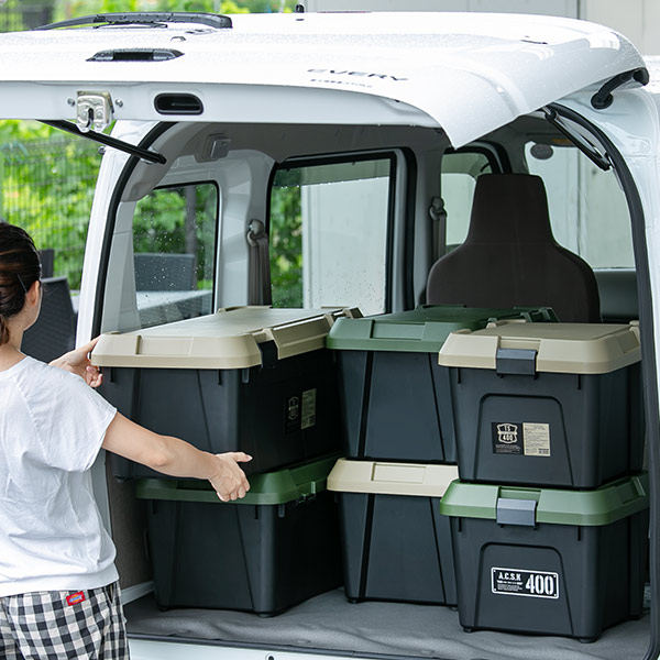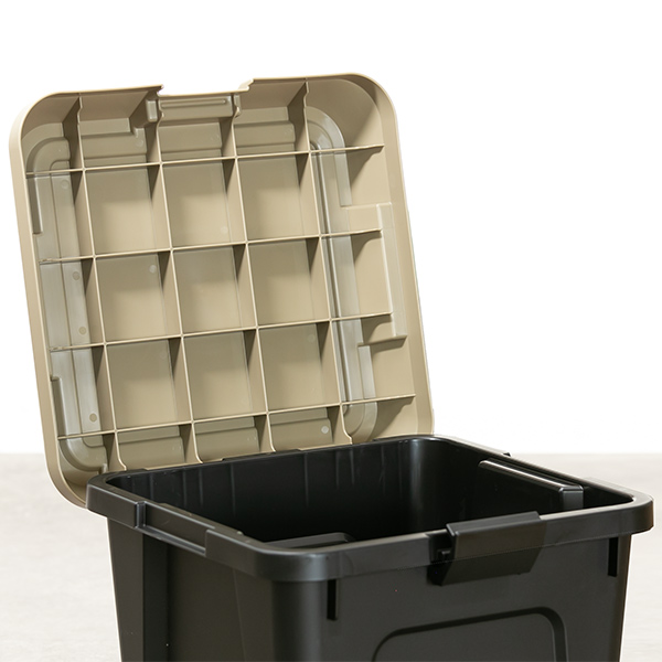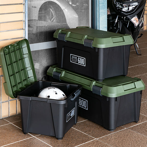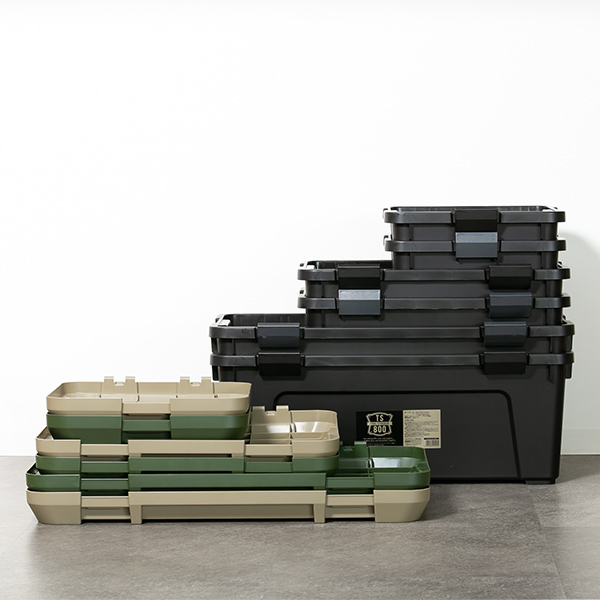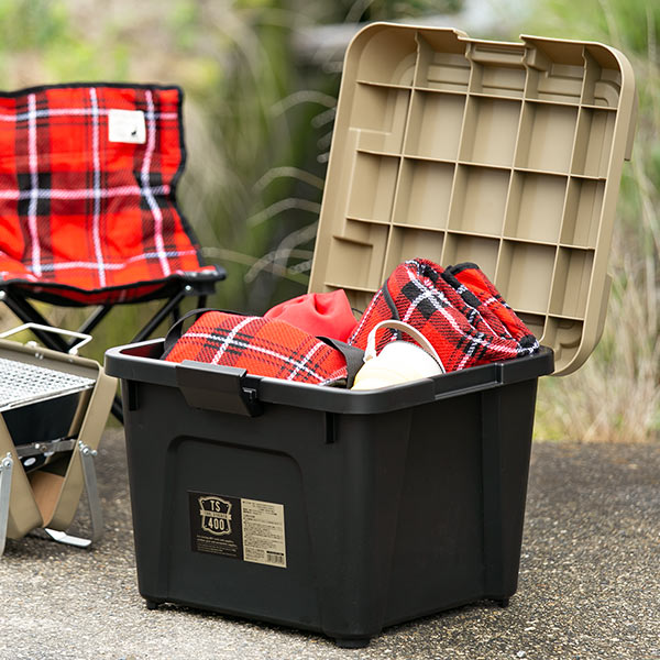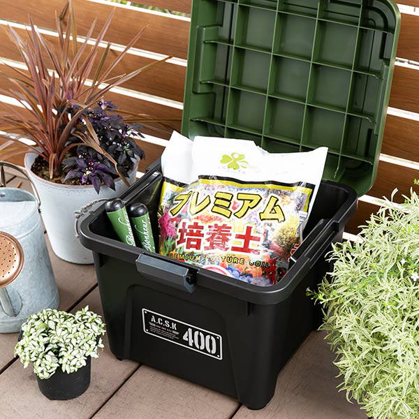 フタ付きで雨水や砂ぼこりの侵入を防ぎ、汚れてもサッと水洗いできるため、工具類、キャンプ用品、園芸用品、洗車用品など屋外で使用するアイテムの収納にぴったりです。車のトランクに積んでおけば、外出先でも役立ちます。