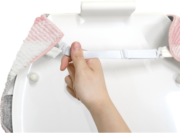U型・O型のフタに装着する場合は、調整ゴムのフックをフタカバーの両サイドに掛けるだけで、しっかりと固定が可能です。