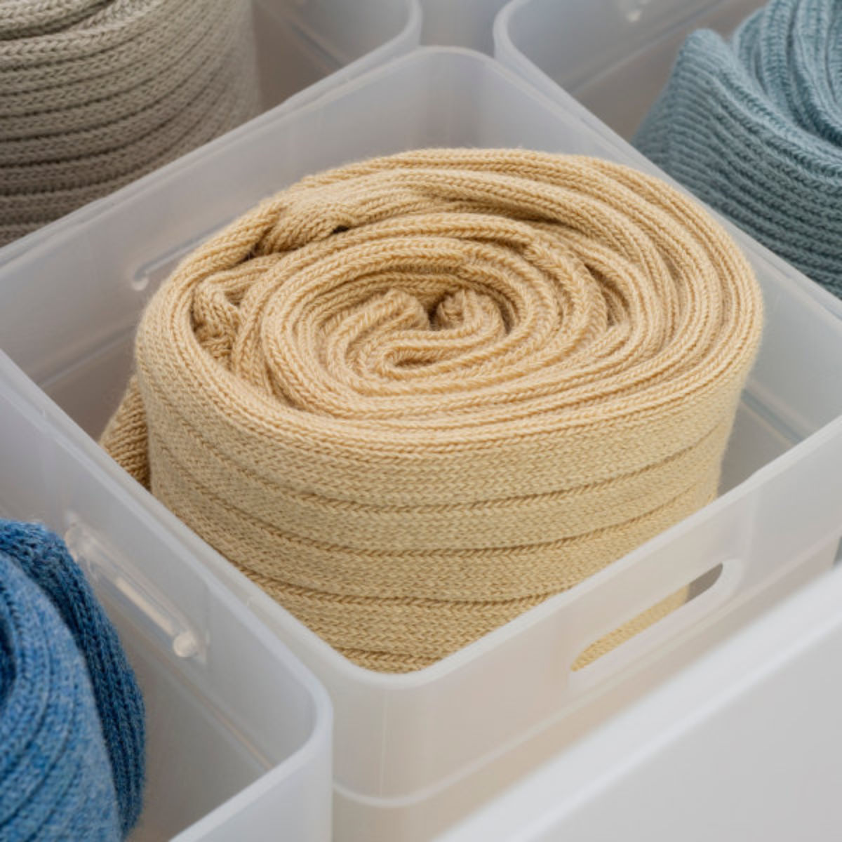 くるくるっと丸めてカップに入れるだけでキレイに収納できます。靴下の履き口のゴムが伸びるのも防げます。